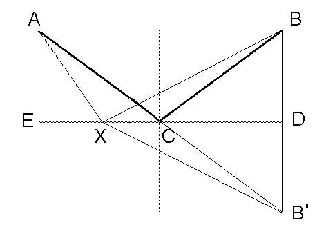 Ze wzglêdu na symetriê układu (trójkąty CDB i CDB są przystające) czas przejścia światła z punktu B do A bêdzie równy czasowi przejścia światła z punktu B do A (odcinki BX i XB są równe dla dowolnego punktu X leżącego na przeciêciu granicy pomiêdzy ośrodkami i płaszczyzny padania). Najkrótszy czas przejścia z punktu B do punktu A odpowiada drodze BCA, gdy punkty B, C i A leżą na jednej prostej (czyli gdy punkt X jest punktem C). Wobec tego kąty ECA i BCD są równe i, w konsekwencji (przystawanie trójkątów CDB i DCB oznacza równośæ kątów BCD i BCD), także kąty ECA i DCB muszą byæ równe a to oznacza równośæ kątów padania i odbicia.