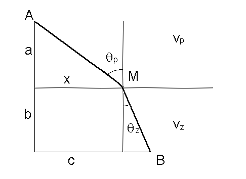 Niech punkty A i B bêdą ustalone. Poszukujemy takiego punktu M (zatem takiej wartości x) dla którego czas przejścia światła z punktu A do punktu B bêdzie najkrótszy. Przyjmujemy, że prêdkośæ światła w ośrodku pierwszym (promieñ padający) jest vp a w ośrodku drugim (promieñ załamany) vz. Czas przejścia przez światło drogi AMB wyniesie wówczas:
