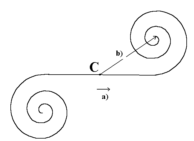 Amplituda prawdopodobieñstwa od jednego toru a) i od wielu torów b). Ponieważ dróg jest bardzo wiele, amplituda od jednej drogi jest stosunkowo mała; zatem wiele dróg daje razem amplitudê której wartośæ odpowiada punktowi lezącemu na praktycznie ciągłej krzywej, zwanej spiralą Cornu. Skrajne drogi, daleko od punktu C dają wkłady do koñców spirali. Wkłady te znoszą siê w znacznym stopniu, podczas gdy wkłady od torów w pobliźu punktu C determinują wartośæ całkowitego prawdopobieñstwa (czyli długośæ sumarycznego wektora).