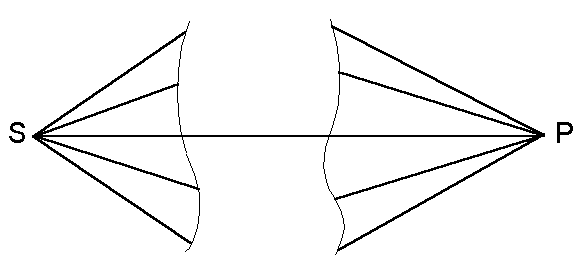 Rys. 6. Idealny układ optyczny symbolicznie przedstawiony liniami falistymi. S to punktowe źródło światła, a P to obraz punktu S, wytworzony przez układ. Układ jest idealny wtedy, gdy P jest punktem.