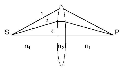 Rys. 7. Układ optyczny (soczewka skupiająca wykonana ze szkła) odwzorowujący punkt S w punkt P. Ponieważ współczynnik załamania szkła jest wiêkszy niż powietrza, dłuższe drogi promieni 1 i 2 w powietrzu i związane z tym wydłużenie czasu przejścia, jest skompensowane krótszą drogą w szkle.