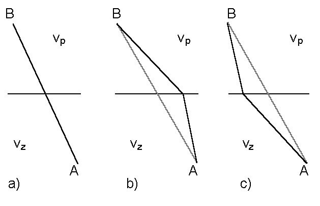 Rys. 5. Promieñ świetlny przechodzi z punktu B (w ośrodku o prêdkości vp) do punktu A (w ośrodku o prêdkości vz). Przypadek a): prêdkości vp i vz są równe, promieñ "wybiera" drogê prostoliniową . Przypadek b): vp >vz, promieñ "wybiera" dłuższą drogê w ośrodku "szybszym", "nadrabiając" stracony czas poprzez skrócenie drogi w ośrodku "wolniejszym" (załamanie "do normalnej"). Przypadek c): vp<vz, odwrotny do b) (załamanie " od normalnej").