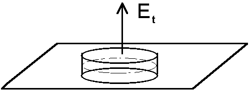 Rys. 35. P³aszczyzna graniczna pomiêdzy dwoma ośrodkami. Cylindryczna zamkniêta powierzchnia Gaussa V obejmuje bardzo ma³y fragment p³aszczyzny granicznej. Pokazana jest sk³adowa Et pola elektrycznego E prostopad³a do powierzchni granicznej, po jednej stronie granicy pomiêdzy ośrodkami.