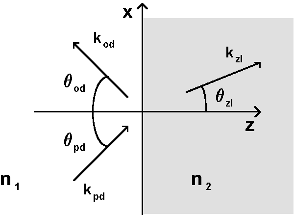Poniewa¿, w rozwa¿anym przez nas przypadku, obie fale w ośrodku 1, tzn fala padająca i odbita, rozchodzą siê w tym samym ośrodku, zatem dlugości wektorów falowych dla tych fal, zale¿ne od wspó³czynników za³amania (k = k0n) tak¿e muszą byæ jednakowe, czyli: