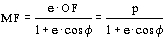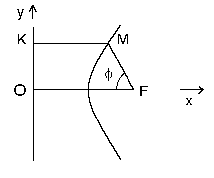 Rys. 8. Rysunek pomocniczy do wyprowadzenia równania krzywych stożkowych we współrzêdnych biegunowych. F - ognisko krzywej stożkowej, prosta KO - kierownica, MF, f - współrzêdne biegunowe. Punkt M jest punktem "bieżącym".