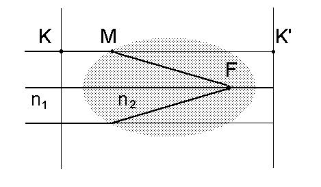 Wynika to z nastêpującego rozumowania: czasy przejścia dla różnych promieni równoległej wiązki są jednakowe na każdej płaszczyźnie prostopadłej do wiązki. Możemy wiêc dla dowolnego promienia świetlnego przyjąæ, że czas przejścia pomiêdzy punktami K i K, leżącymi na dwóch kierownicach elipsy byłby stały dla wszystkich promieni KMK, pod warunkiem oczywiście, że tory tych promieni przebiegają w powietrzu. Czas ten wyniósłby