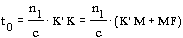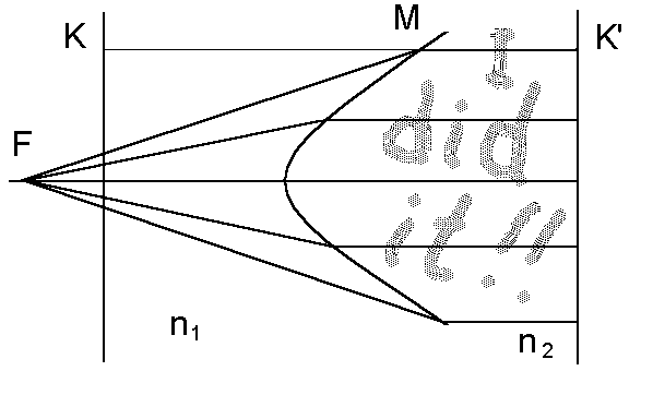 Na rysunku 10 przedstawiono własności ogniskujące układu optycznego w formie hiperboloidy obrotowej. Podobnie jak w przypadku układu elipsoidalnego zakładamy, że współczynnik załamania otaczającego ośrodka (powiedzmy, że jest to powietrze) wynosi n1, a szkła, z którego wykonano układ optyczny, n2. Pokażemy, że rozbieżna wiązka światła wychodząca z ogniska hiperboli F transformuje siê, po przejściu przez powierzchniê oddzielającą oba ośrodki, w wiązkê równoległą. W tym celu wystarczy pokazaæ, że czasy przejścia po różnych torach FMK są równe dla dowolnego punktu M leżącego na hiperboli. Przy tym prosta, na której leży punkt K, może byæ w miarê dowolna, byle równoległa do kierownic hiperboli i umieszczona gdzieś w ośrodku n2. Podobnie jak w przypadku elipsy niech t0 oznacza czas przejścia przez światło odcinka KK pomiêdzy jedną z kierownic i tą drugą prostą, ale w szkle, a nie w powietrzu tak jak poprzednio (t0 = KK× n2 / c). Przyjmując tym razem, że e = n2 / n1 (e > 1 dla hiperboli), z relacji KM× e = FM (która obowiązuje w przypadku hiperboli dla obu jej gałêzi niezależnie, którą parê kierownica - ognisko wybierzemy, lewą czy prawą) mamy KM× n2 = FM× n1 i, wobec tego: