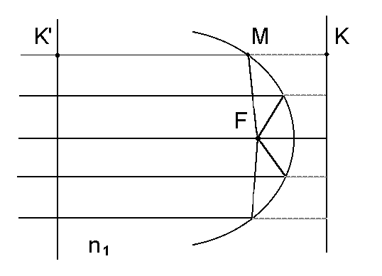 który to czas, wobec równości MK = MF, bêdzie równy czasowi przejścia w powietrzu po wszystkich torach KMF, dla dowolnego M leżącego na paraboli. Równośæ czasów przejścia, z zasady Fermata oznacza, że równoległa wiązka światła padająca na układ zostanie skupiona w punkcie F lub, innymi słowami, że rzeczywisty obraz nieskoñczenie daleko leżącego punktowego przedmiotu znajdzie siê w ognisku F paraboli (Feynman, t. 1, cz. 2, str. 20).