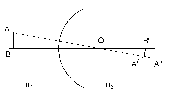 Na rysunku 16 przedstawiamy "obiekt", który składa siê z dwóch punktów, A i B, przy tym odcinek AB jest prostopadły do prostej wyznaczonej przez punkty BOB. Obrazy punktów B i A bêdą leżały w odległościach wyznaczonych przez równanie pojedynczej powierzchni, na prostych AO i BO; przyjmijmy, że bêdą to punkty B i A. Chcemy ustaliæ, czy punkt A jest przesuniêty w stronê "do" czy "od" powierzchni załamującej wzglêdem punktu A (odcinek AB jest prostopadły do prostej BOB). W tym celu róniczkujemy równanie pojedynczej powierzchni i otrzymujemy