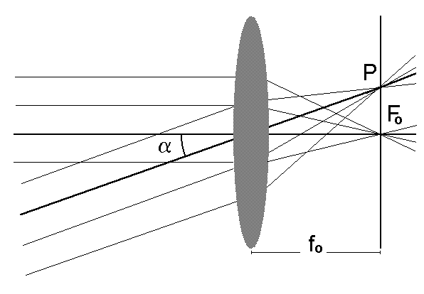 Rys. 17. Wiązki równoległe o różnym kącie nachylenia do osi optycznej są ogniskowane w różnych punktach leżących w płaszczyźnie ogniskowej przechodzącej przez ognisko obrazowe Fo i prostopadłej do osi optycznej. Odległośæ PFo »afO.