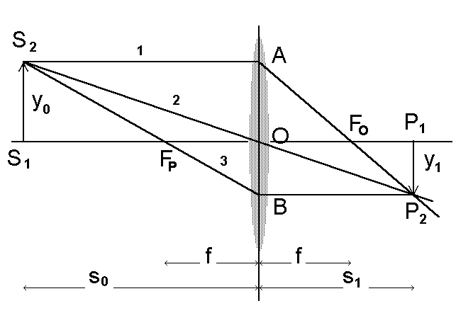 Wytyczenie biegu każdych dwóch spośród trzech wyliczonych wyżej promieni do punktu ich przeciêcia (w przypadku obrazu pozornego należy przedłużyæ promienie "wstecz"), wystarcza do znalezienia obrazu dowolnego punktu; zatem po uwzglêdnieniu dostatecznej liczby punktów, także dowolnego trójwymiarowego przedmiotu. Na rys. 18 obraz P2 punktu S2 stanowiącego "czubek" strzałki S1S2 utworzony przez soczewkê cienką o ogniskowej f, ogniskach FP i OF, został wyznaczony jako punkt przeciêcia trzech wybranych promieni: równoległego (1), głównego (2) i ogniskowego (3). Obrazem punktu S1 jest punkt P1. W ten sposób łatwo znajdujemy rzeczywisty obraz P1P2 przedmiotu S1S2, którym jest strzałka. Obraz jest rzeczywisty, odwrócony i pomniejszony co wynika z faktu, że odległośæ s0 jest wiêksza od 2f (z równania soczewkowego można wówczas znaleźæ, źe f £ s1 £ 2f) a o powiêkszeniu za chwilê dokładniej.