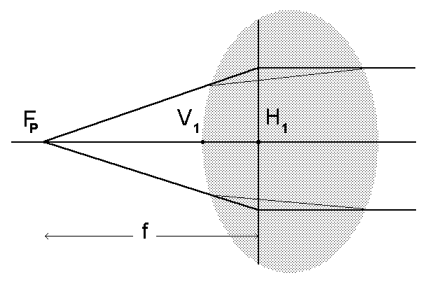 Rys. 19. Rzeczywisty (linia przerywana) i zgodny z modelem Möbiusa-Gaussa przebieg promieni tworzących rozbieżną wiązkê światła rozchodzącego siê z ogniska FP soczewki grubej. W rzeczywistości załamanie nastêpuje na obu powierzchniach sferycznych; zgodnie z modelem, wyłącznie na płaszczyznach głównych. Na rysunku pokazano pierwszą płaszczyznê główną, której przeciêcie z osią optyczną wyznacza pierwszy punkt główny H1.