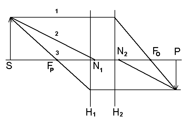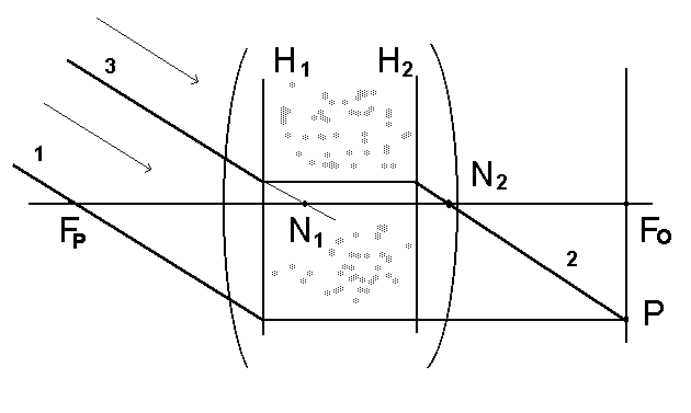 Rys. 21. Wytyczanie biegu promienia równoległego (1), głównego (2) i ogniskowego (3) przez soczewkê grubą lub złożony układ optyczny. FP i FO oznaczają ogniska, N1 i N2 punkty wêzłowe, a H1 i H2 - płaszczyzny główne.