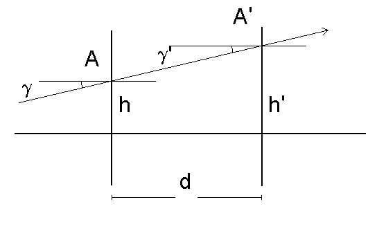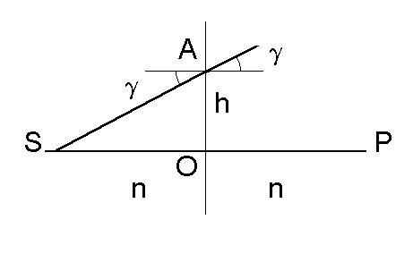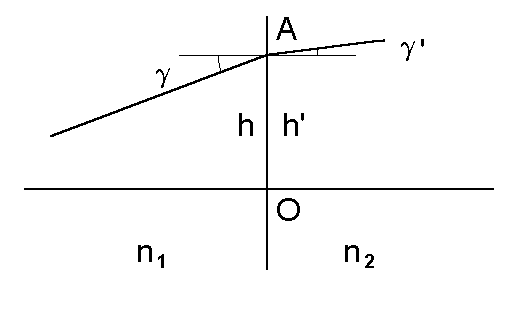 Opis przebiegu promienia świetlnego w układzie optycznym wymaga przede wszystkim wprowadzenia charakterystycznych dla niego "współrzêdnych", które opisywaæ bêdą jego w tym układzie "położenie". Jak pokazano na rys. 22, promieñ w układzie o osi optycznej SOP, przecinający pewną powierzchniê w punkcie A, może byæ jednoznacznie opisany przez podanie dwóch liczb; kąta g , który ten promieñ tworzy z osią optyczną i odległości od osi optycznej, h. Tak wiêc każdemu promieniowi możemy przypisaæ jednokolumnową macierz o dwóch wierszach (1x2):
