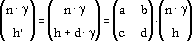 Oczywiście wiemy, że przejście promienia np przez granicê ośrodków o różnych współczynnikach załamania zmieni kąt g ; z drugiej strony tylko dla g = 0 mielibyśmy zawsze to samo h, tak wiêc dużo może siê zmieniaæ i powinniśmy dokładniej zbadaæ, co siê dzieje z macierzą reprezentującą promieñ w różnych sytuacjach. Zaczniemy od najprostszej, zbadamy, co siê dzieje z macierzą x po przejściu jednorodnej warstwy o grubości d i współczynniku załamania n (rys. 23). Symbolicznie możemy, korzystając z zapisu macierzowego, przedstawiæ tê transformacjê w nastêpujący sposób: