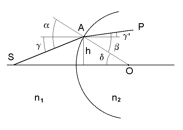 Rys. 25. Transformacja macierzy promienia świetlnego na granicy dwóch ośrodków o współczynnikach załamania n1 i n2. Powierzchnia ma kształt sferyczny, ze środkiem w punkcie O i promieniu krzywizny AO równym R. Promieñ padający SA przechodzi w promieñ AP; wysokośæ h jest zachowana, a kąt g ulega zmianie zgodnie z prawem Snella.
