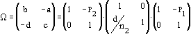 Mając do dyspozycji macierze reprezentujące różne elementy układu optycznego, możemy obliczyæ przebieg promienia świetlnego przez cały układ, mnoźąc kolejno macierz promienia x przez odpowiednie macierze elementów układu. Inny sposób postêpowania, znacznie bardziej ogólny, polega na obliczeniu macierzy reprezentującej cały układ. Nastêpnie, zmieniając odpowiednio macierz promienia i mnożąc tê macierz przez macierz całego układu możemy otrzymaæ cały zbiór promieni wychodzących z układu. Dla przykładu obliczymy teraz macierz charakteryzującą soczewkê grubą o grubości d i dwóch cylindrycznych powierzchniach łamiących o promieniach krzywizny R1 i R2 (zmieniając znak promieni krzywizny bêdziemy mogli uwzglêdniæ różne soczewki, dwuwypukłe, dwuwklêsłe, płasko - wypukłe itd). Macierz soczewki grubej (oznaczymy ją W (R1,d,R2)) powinna zawieraæ macierz załamania pierwszej powierzchni łamiącej S 1(R1), nastêpnie macierz translacji  (d) i w koñcu macierz drugiej powierzchni łamiącej S 2(R2). A zatem, pisząc macierze składowe w odpowiedniej kolejności (ta macierz, która "wcześniej" działa na promieñ, wystêpuje po prawej stronie) otrzymamy: W (R1,d,R2) = S 2(R2)× Â (d)× S 1(R1). Podstawiając mamy: