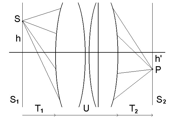 Na rys. 26 pokazany jest pewien specjalny przypadek, w którym układ odwzorowuje punkt S na punkt P. Tak nie zawsze musi byæ, załóźmy na razie, źe punkt P został wyznaczony przez przeciêcie płaszczyzny S2 pewnym (byæ moźe jedynym) promieniem wychodzącym z punktu S i przechodzącym przez układ optyczny (wiêkszośæ promieni, wchodzących do układu musi z niego wyjśæ, to ma byæ w koñcu układ optyczny a nie czarna dziura). Dla tego szczególnego promienia bêdziemy oczywiście mieli nastêpującą relacjê: