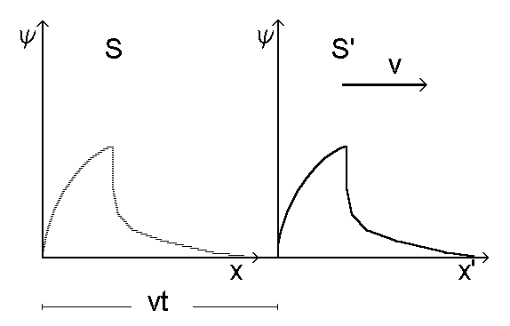 która opisuje transformacjê z nieruchomego uk³adu S do uk³adu S poruszającego siê z prêdkością rozchodzenia siê fali v i w kierunku rozchodzenia siê fali. Mamy wtedy: