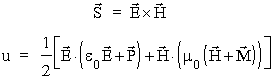 Znaczenie pierwszych dwóch wyrazów jest oczywiste; przedstawiają one gêstośæ energii pola elektromagnetycznego w pró¿ni. Oczywiście, w naszym przypadku oprócz tych dwóch wyrazów spodziewamy siê tak¿e wk³adu od wyindukowanych w ośrodku, dziêki polom w pró¿ni, E i B0 = m 0H, dipoli elektrycznych i momentów magnetycznych. Poniewa¿ energia potencjalna ka¿dego elementarnego dipola (qd i m , jak je oznaczaliśmy poprzednio) jest równa iloczynowi skalarnemu tego momentu i pola, z którym ten dipol oddzia³uje (jeśli ktoś nie pamiêta tych wzorów, to na pewno znajdzie je w Feynmanie), zatem ca³kowita energia potencjalna ca³ego uk³adu dipoli wyrazi siê poprzez średni moment dipolowy tego uk³adu, a gêstośæ energii potencjalnej wyrazi siê poprzez moment dipolowy na jednostkê objêtości, czyli polaryzacjê lub namagnesowanie. Dok³adnie taką w³aśnie postaæ mają pozosta³e dwa wyrazy w naszym wyra¿eniu na ca³kowitą gêstośæ energii pola elektromagnetycznego w ośrodku materialnym.