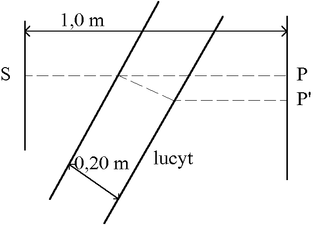 Źród³o S wysy³a wąską wiązkê świat³a prostopad³ą do ekranu oddalonego o 1,0 m. Promieñ pada na ekran w punkcie P. Na drodze wiązki umieszczono p³ytkê lucytową o grubości 0,20 m i o wspó³czynniku za³amania 1,50. Przyjmując, ¿e kąt padania wiązki na powierzchniê p³ytki wynosi 30° , oblicz: