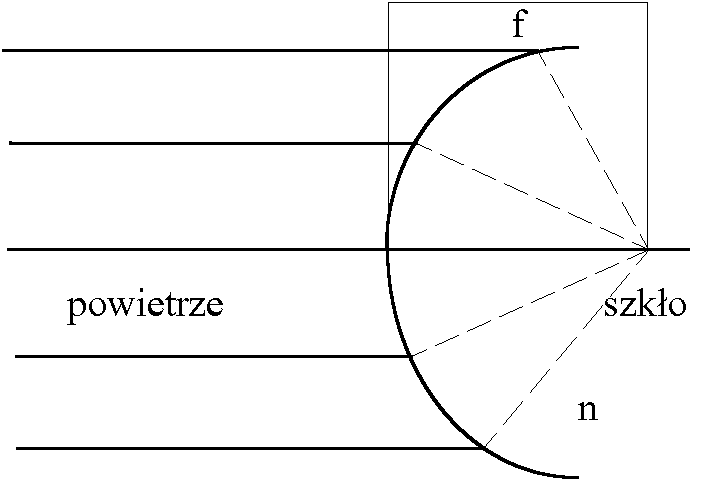 Czasza kulista o średnicy 10 cm zanurzona jest w oleju o n = 1,62. Znale¼æ ogniskową odpowiadającą pierwszej powierzchni dla świat³a padającego na tê powierzchniê sferyczną z zewnątrz.