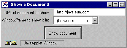 showDocument. The applet brings up a window that lets you type in a URL and choose any of theshowDocumentoptions. When you press Return or click the Show document button, the applet callsshowDocument.