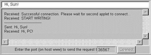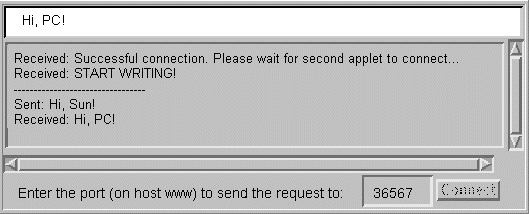 This page features an example of a server that allows two applets to communicate with each other. The applets don't have to be running on the same page, in the same browser, or on the same computer. As long as the applets originate from the same computer, they can communicate through the server that's running on that originating computer. The example uses sockets, which are documented in All About Sockets