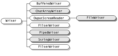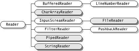 Reader(in the API reference documentation) and Writer(in the API reference documentation) are the abstract superclasses for character streams in java.io. Reader provides the API and partial implementation for readers--streams that read 16-bit characters--and Writer provides the API and partial implementation for writers--streams that write 16-bit characters. Subclasses of Reader and Writer implement specialized streams and are divided into two categories: those that read from or write to data sinks (shown in gray in the following figures) and those that perform some sort of processing (shown in white). The figure shows the class hierarchies for the Reader and Writer classes.