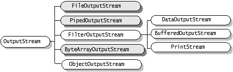 As with Reader and Writer, subclasses of InputStream and OutputStream provide specialized I/O that falls into two categories, as shown in the following class hierarchy figure: data sink streams (shaded) and processing streams (unshaded).
