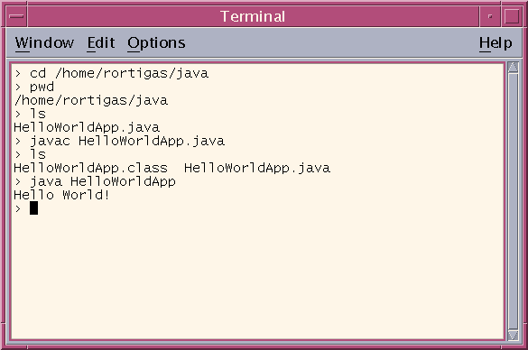 pwdat the prompt, you should see/home/rortigas/java. If you enterlsat the prompt, you should see your.javaand.classfiles. Now enterjava HelloWorldAppagain.If you still have problems, you might have to change your CLASSPATH variable. To see if this is necessary, try "unsetting" the classpath with the following command: