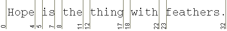 BreakIteratorhas an imaginary cursor that points to the current boundary in a string of text. You can move this cursor within the text with thepreviousand thenextmethods. For example, if you've created aBreakIteratorwithgetWordInstance, the cursor moves to the next word boundary in the text every time you invoke thenextmethod. The cursor-movement methods return an integer indicating the position of the boundary. This position is the index of the character in the text string that would follow the boundary. Like string indexes, the boundaries are zero-based. The first boundary is at 0, and the last boundary is the length of the string. The following figure shows the word boundaries detected by thenextandpreviousmethods in a line of text: