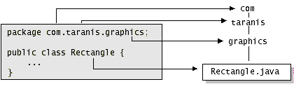 class name graphics.Rectanglepathname to file graphics/Rectangle.javaAs you may recall, by convention a company uses its reversed Internet domain name in its package names. The fictional company whose Internet domain name is