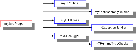 The next figure illustrates calling native language functions from a Java application. This diagram shows the many possibilities for utilizing the JNI from a Java program, including calling C routines, using C++ classes, calling assembler routines, and so on.