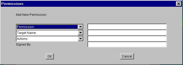 Note: If you wanted to restrict the permission to just code signed bysusanthat comes from theC:\Test\directory, you would type the following URL into the CodeBase text box:file:/C:/Test/*To add the permission, choose the Add Permission button. This brings up the Permissions dialog box.