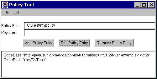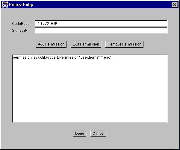 You are now done specifying this policy entry, so choose the Done button in the Policy Entry dialog. The Policy Tool window now includes a line representing the new policy entry, showing the CodeBase value.