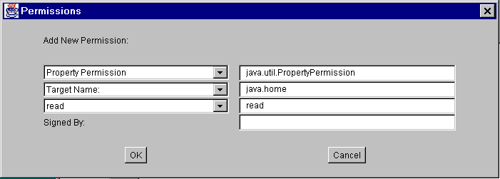 To add permission to read the "java.home" property value, choose the Add Permission button again. In the Permissions dialog box, do the following: