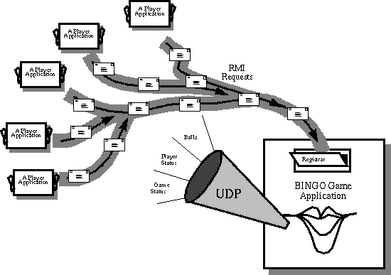 Click the image to view it at its natural size.As you can see from the diagram, the Game and the Players have two different forms of communication and use two different mechanisms for them. First, the Game broadcasts status information to all the Players over UDP. Second, the Player makes individual requests of the Game via RMI.